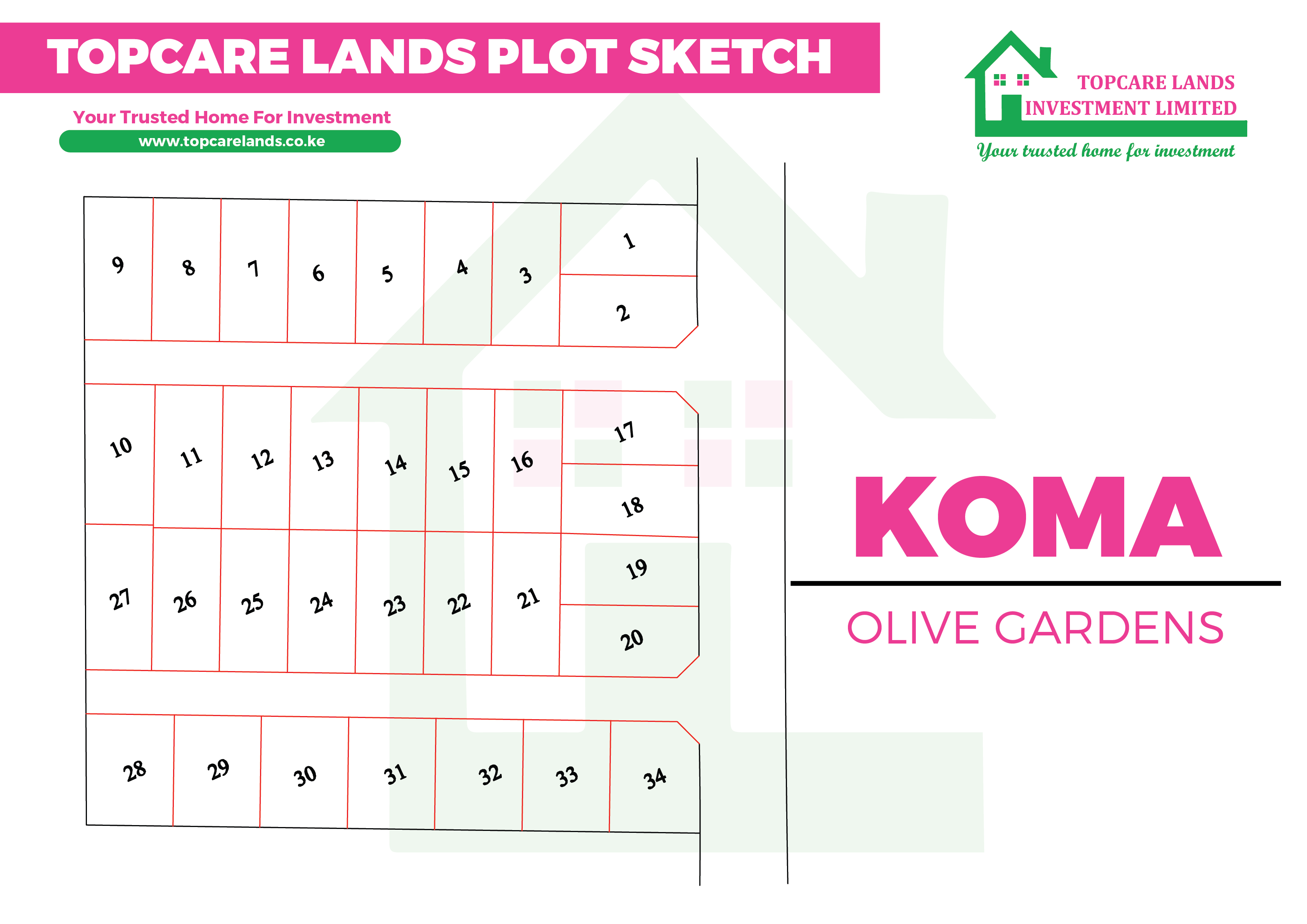 Welcome to Koma Olive Gardens by Topcare Lands Kenya located at 1.8kms from Komarock Town off Kangundo Road with social Amenities: Komarock Primary School, Maisha Mazuri Primary and Junior School, Kinyau Secondary School, Mary Mother of God Caholic Parish, Hope Medical Centre The plots are value-packed with features such as: –