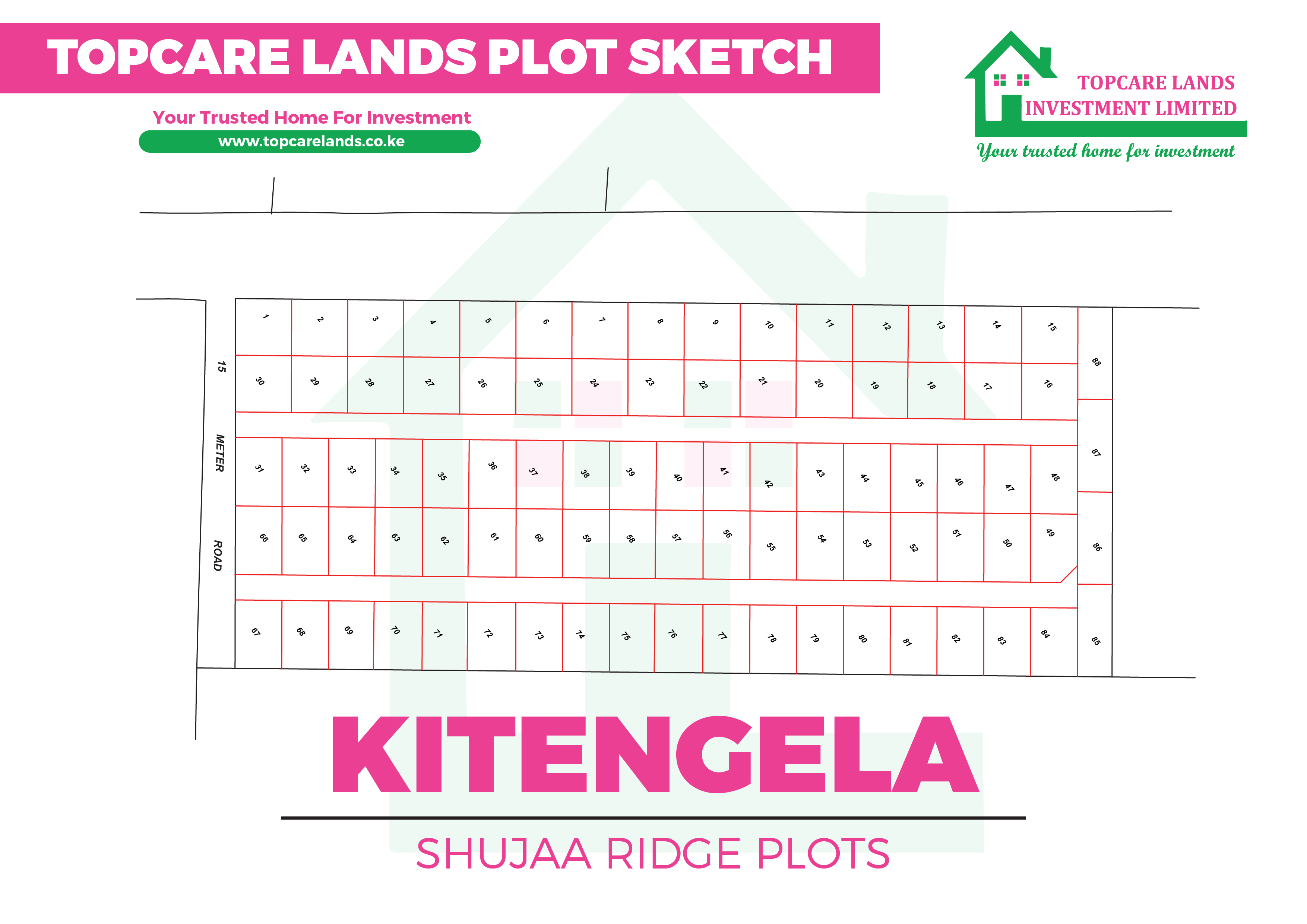 Welcome to Kitengela Shujaa Ridge by Topcare Lands Kenya located 2.5km off Nairobi Namanga Highway at Kisaju with social amenities: KAG University, Kitengela Boys High School, Sucos Hospital, Nellion Preparatory School, Kisaju Prayer Centre.The plots are value-packed with features such as