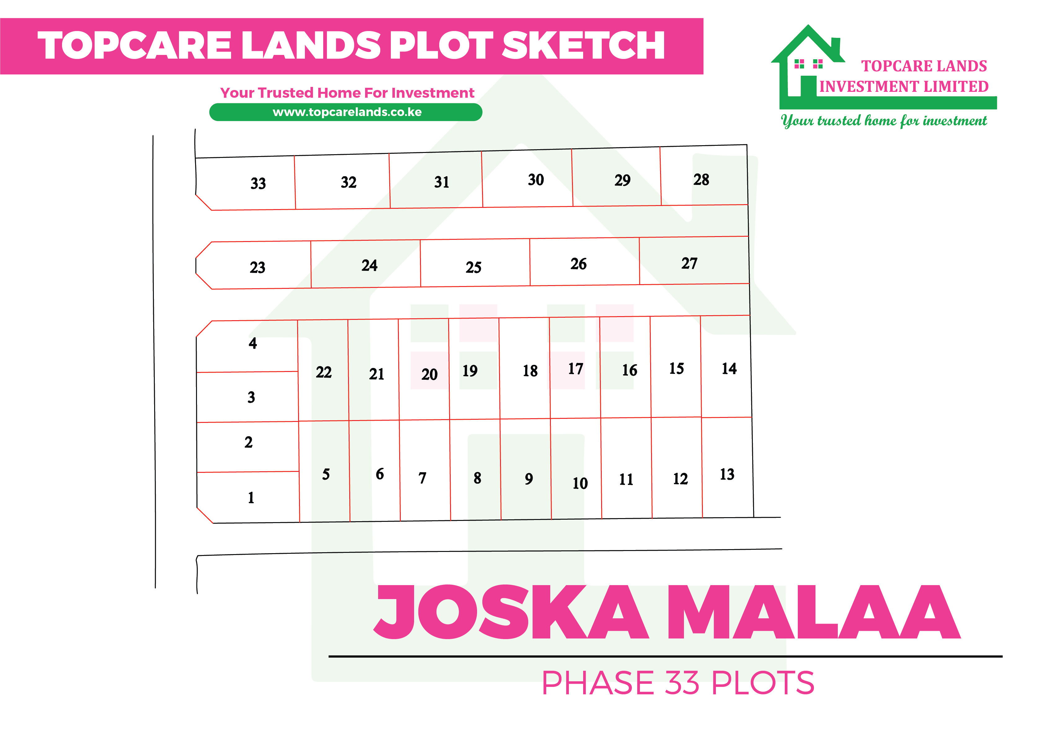 Introducing Joska Sunshine Gardens, a prime project for sale located 6kms from Malaa Town off Kangundo road with social amenities: Deliverance Church Mwangaza, Mbiiani Primary School The plots are value-packed with features such as: –